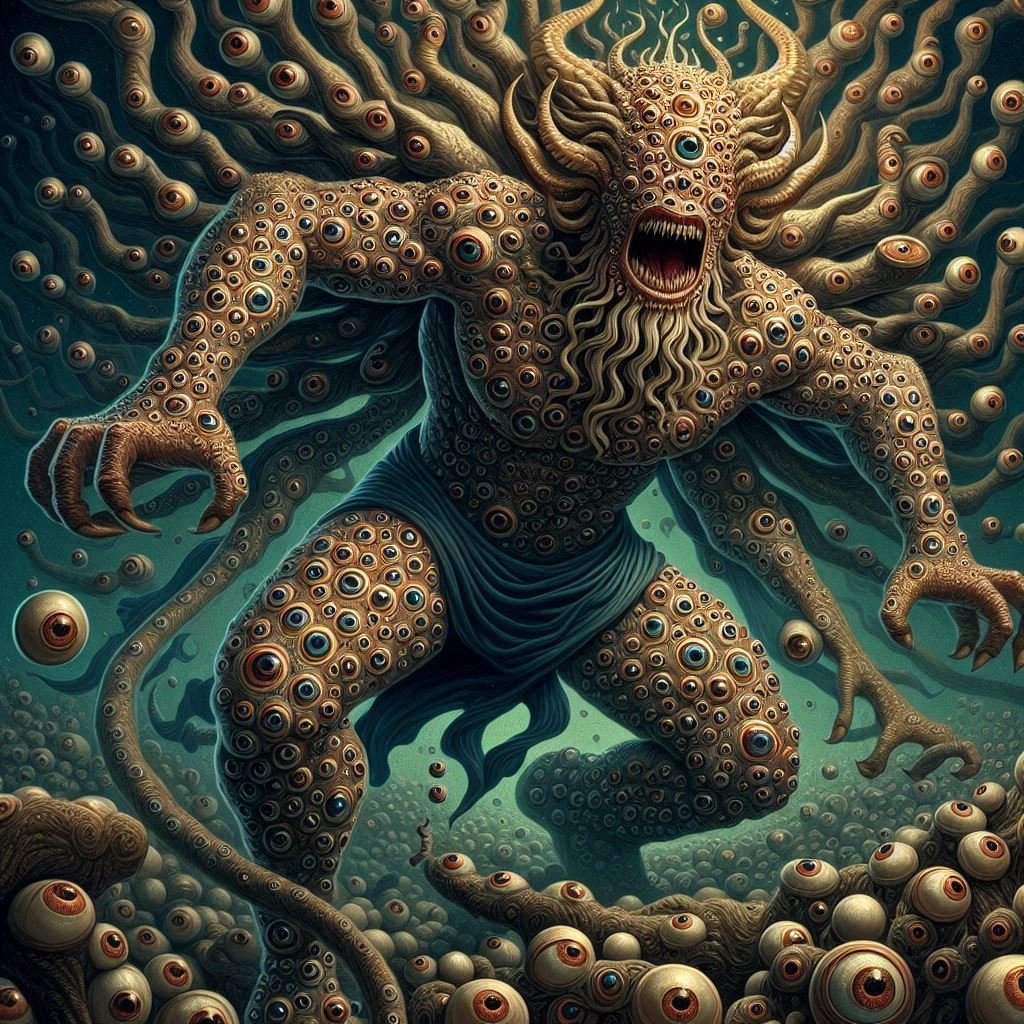 He is described as being a giant humanoid, with a hundred dragon heads on the tips of his serpentine hands, which were so long (a hundred leagues each, they say) that one reached the ends of the world while his feet were said to touch the depths of Tartarus.